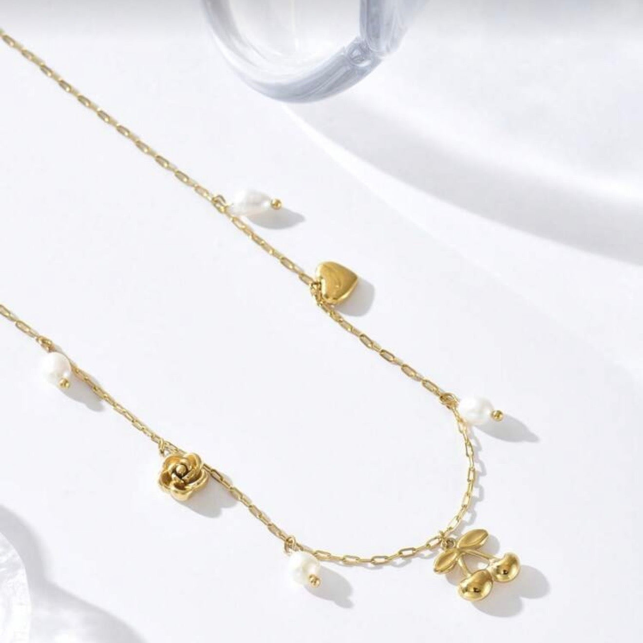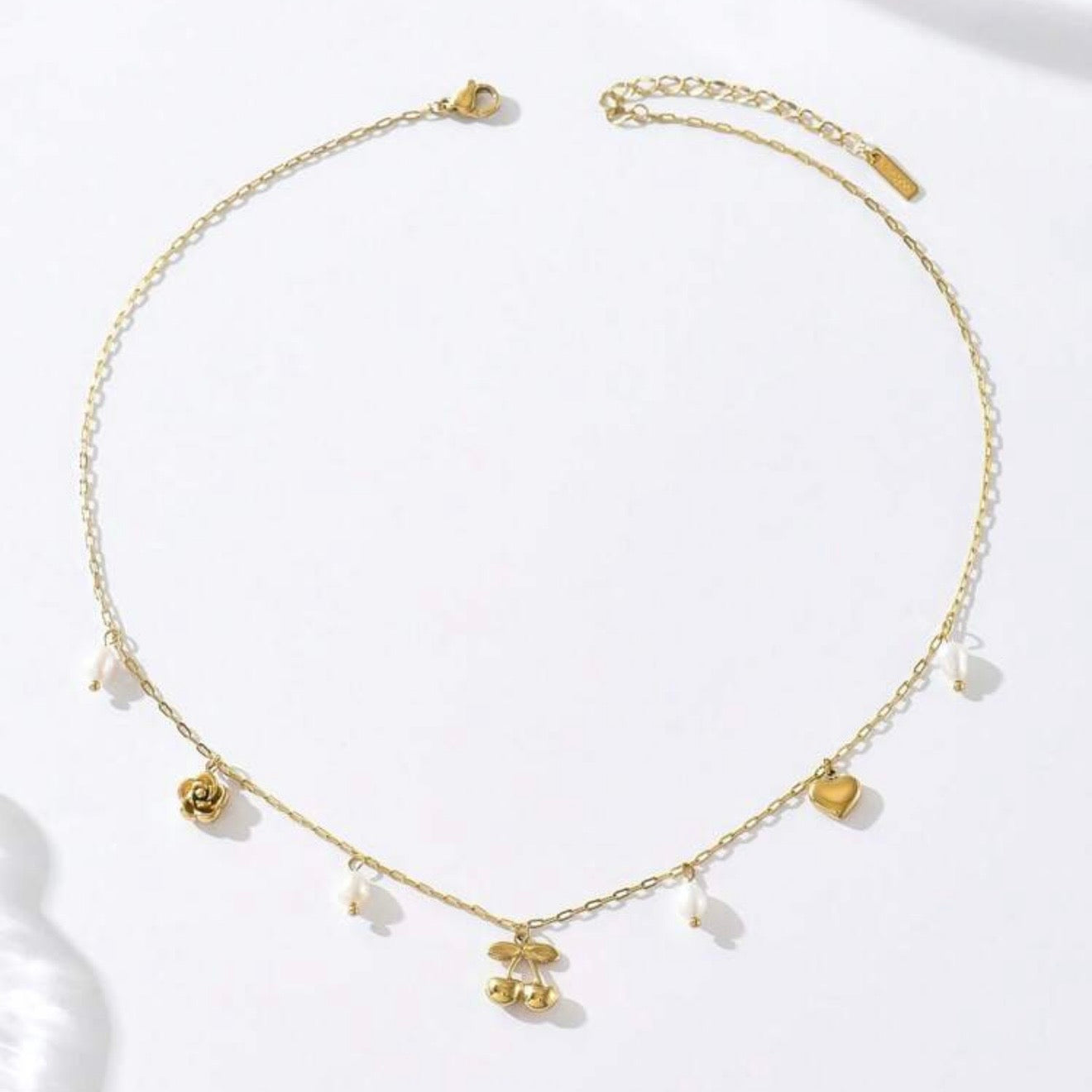 Add a touch of timeless elegance to your everyday look with this dainty gold-plated necklace. Designed with delicate freshwater pearls and charming pendants — a rose, a heart, and a cherry — it embodies femininity, sweetness, and effortless luxury.