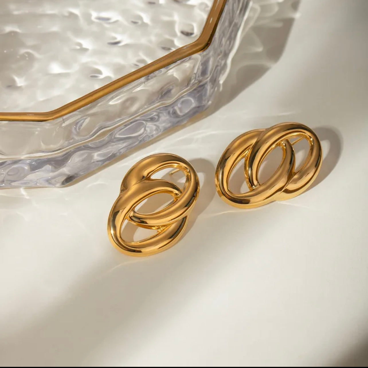 Elevate your accessory game with these 18K Gold Plated Interlocking Hoop Earrings, crafted from premium stainless steel for a bold yet elegant statement. These chunky double hoop studs feature a smooth, high-shine finish and a trendy design that flatters any outfit—from casual chic to evening glam.
