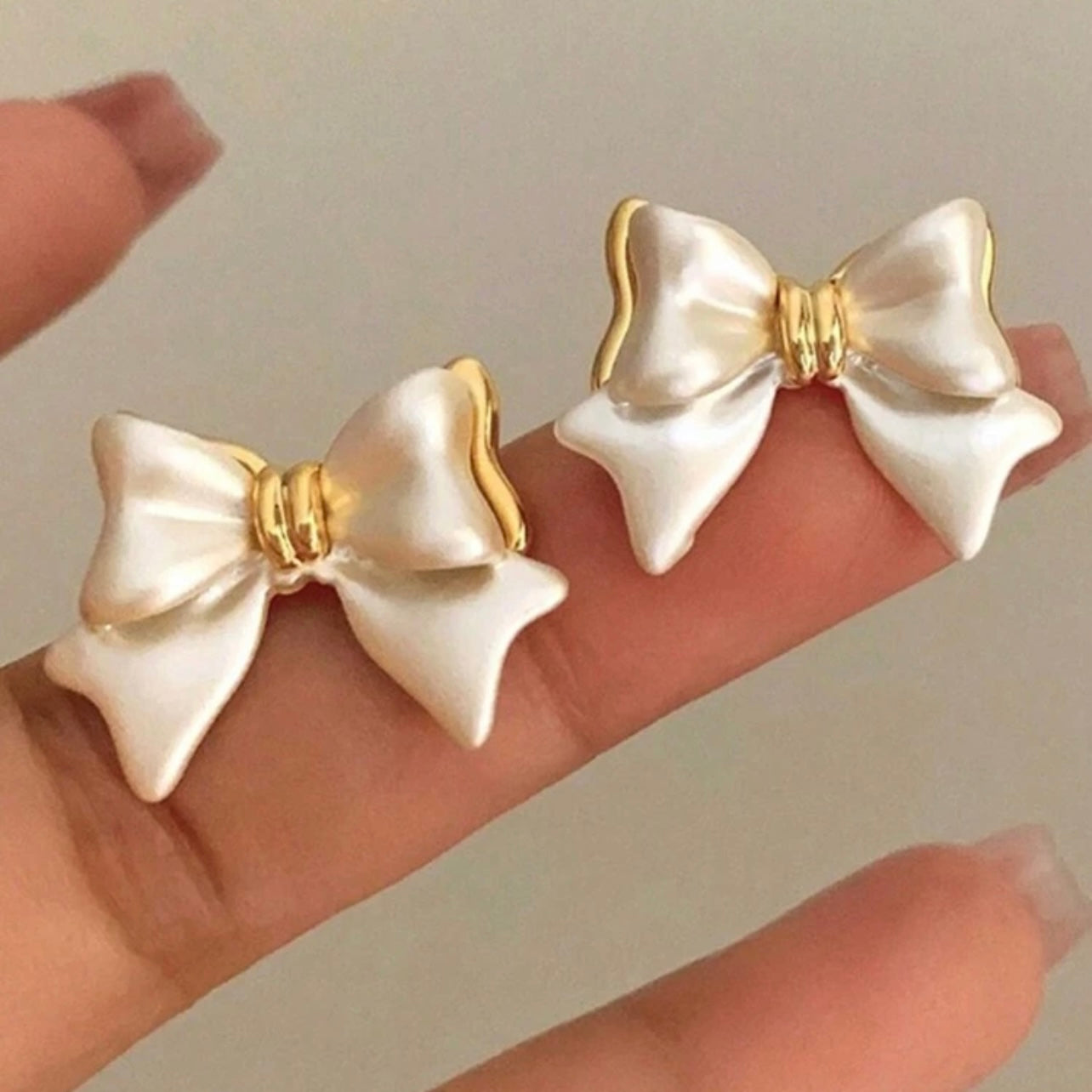 Crafted with a lustrous pearl-like finish and outlined in gold, these bow-shaped studs bring the perfect balance of sweetness and sophistication. Ideal for everyday wear, romantic dates, or special occasions.